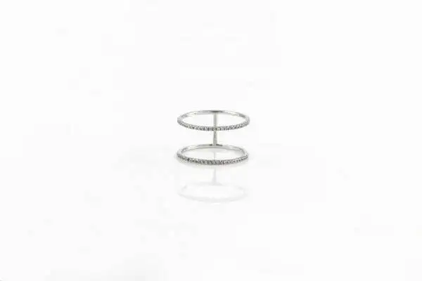 Eleve seu visual com o Anel Dois Aros com Diamantes em Ouro Branco 18k, uma peça que captura a essência da beleza e da elegância atemporal.